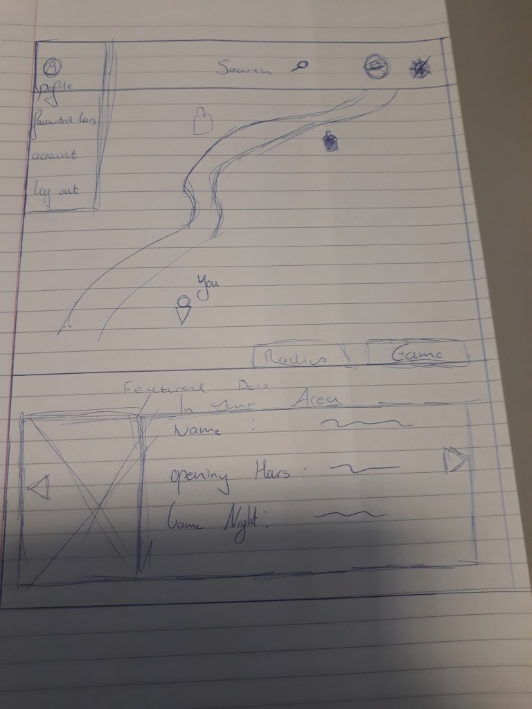 For our second iteration of the design we took some of the feedback given with regards to the inclusion of a larger bar view, and the start of a profile page for users. The idea behind the profile page would be for later integration with more ‘social’ features, such as being able to add friends through the app and organize groups for further nights out. The bar profile would display what games the bar had on offer, what users rated their experience of the bar was and what their opening and closing times were.