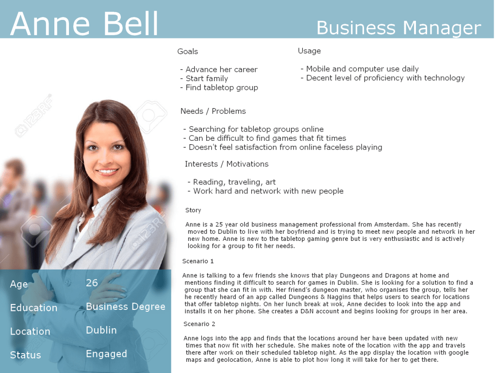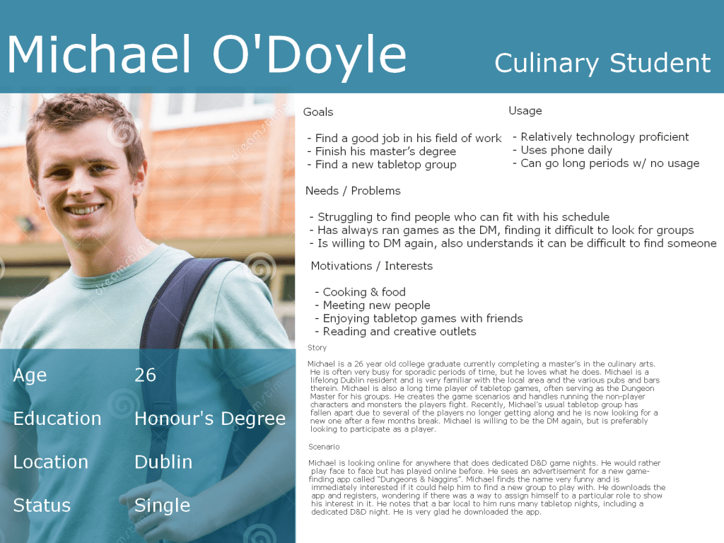 Once we received our feedback from both the interviews and surveys, we set about constructing our personas. To provide a more real, human experience, we described their background, their goals and problems and what they’re looking for currently. Our personas covered the type of people who would find general use out of the app. Both personas created gave an idea as to what someone who is only casually involved in the tabletop gaming genre would be looking for and someone who is more experienced.